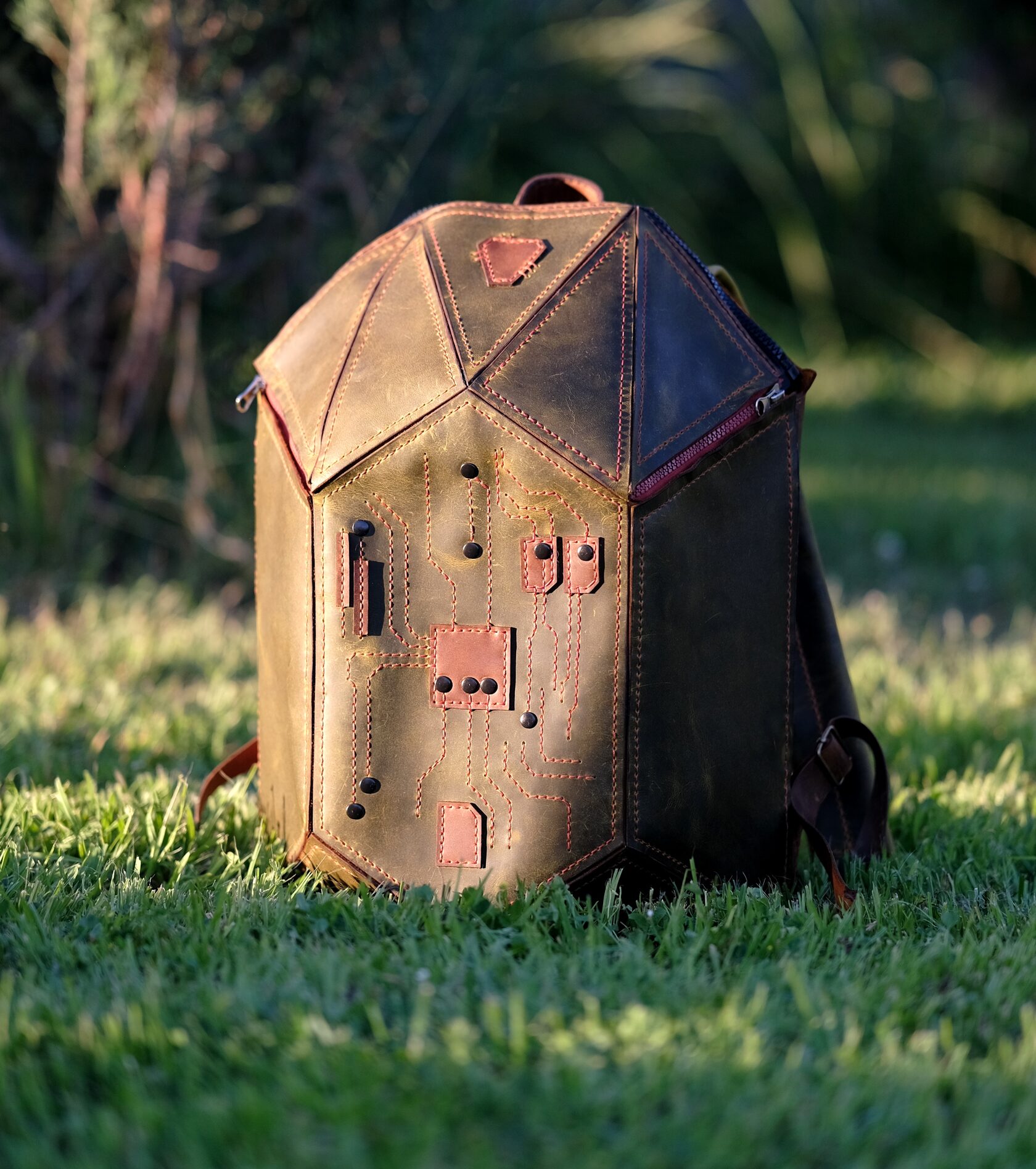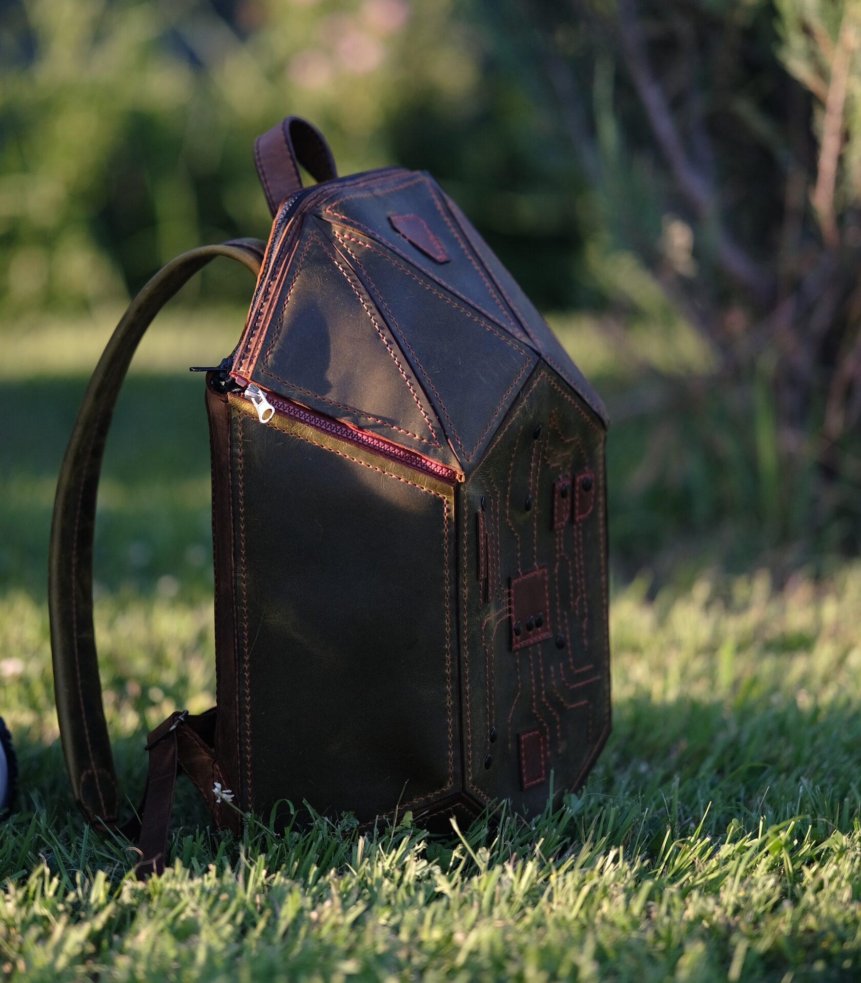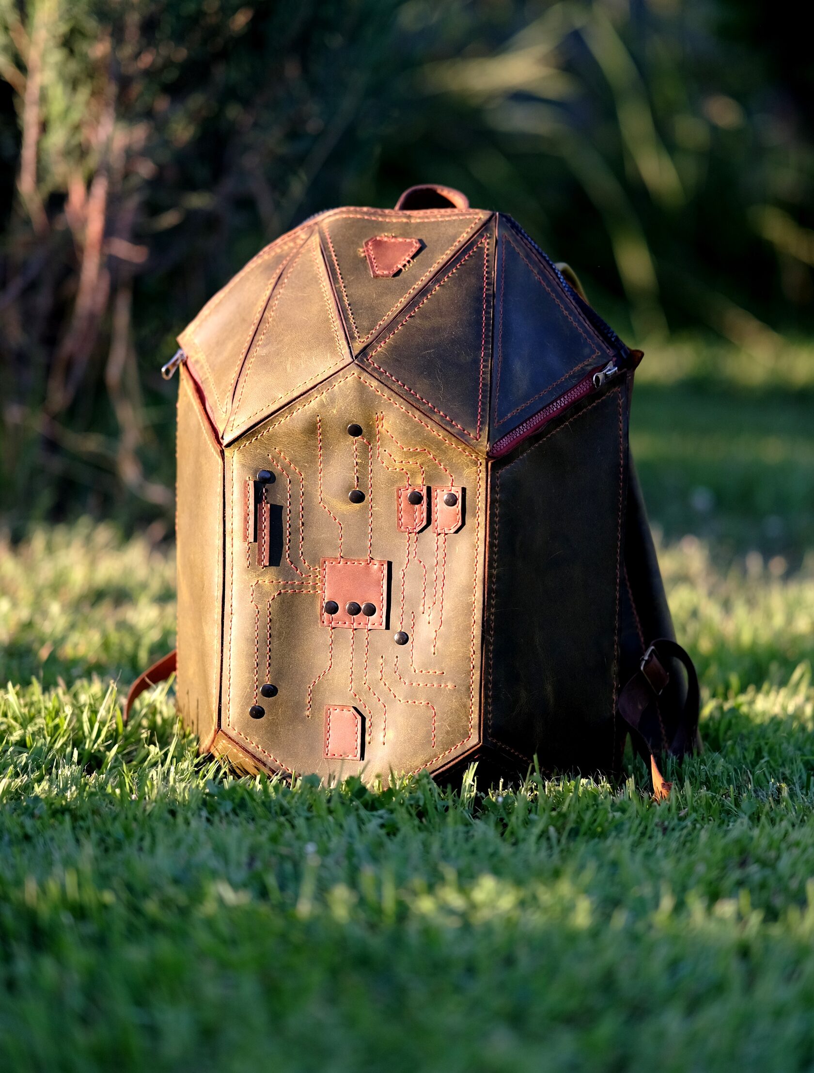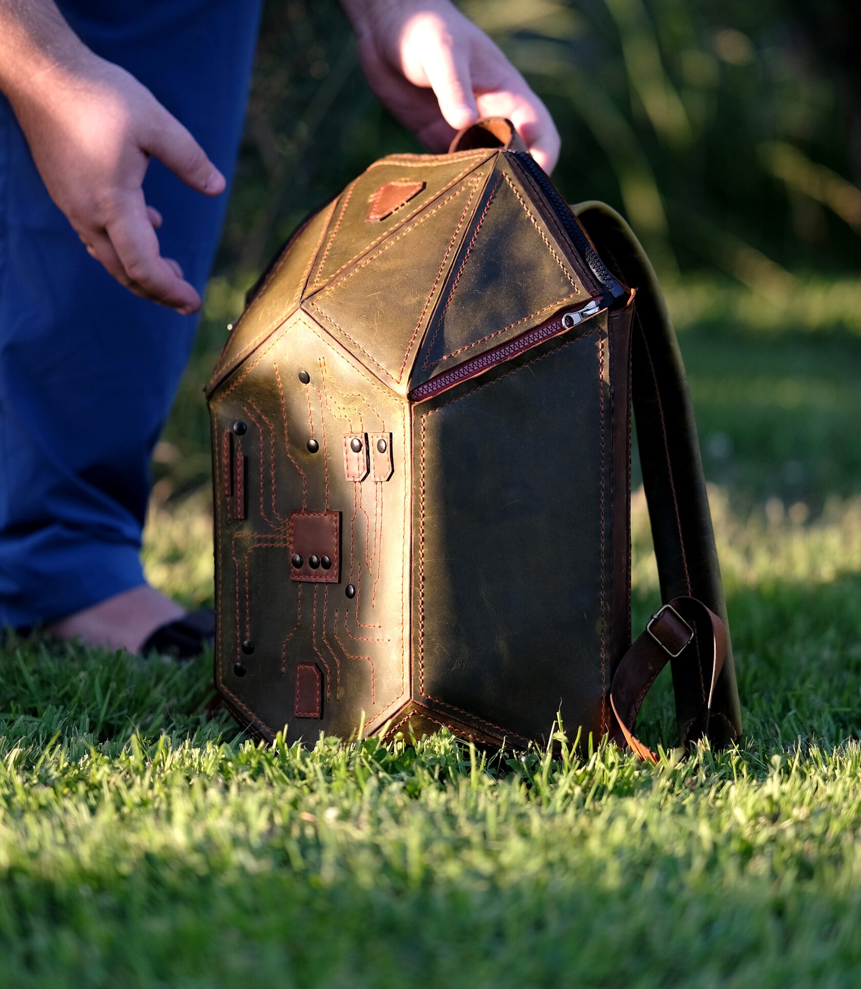 Уникальный рюкзак из натуральной кожи ручной работы, созданный в стиле хай-тек. Геометричная форма и декоративная строчка в виде печатной платы подчёркивают характер владельца — человека технологий и идей. Вместительный, прочный и необычный, он объединяет функциональность и арт-объект, который невозможно не заметить.