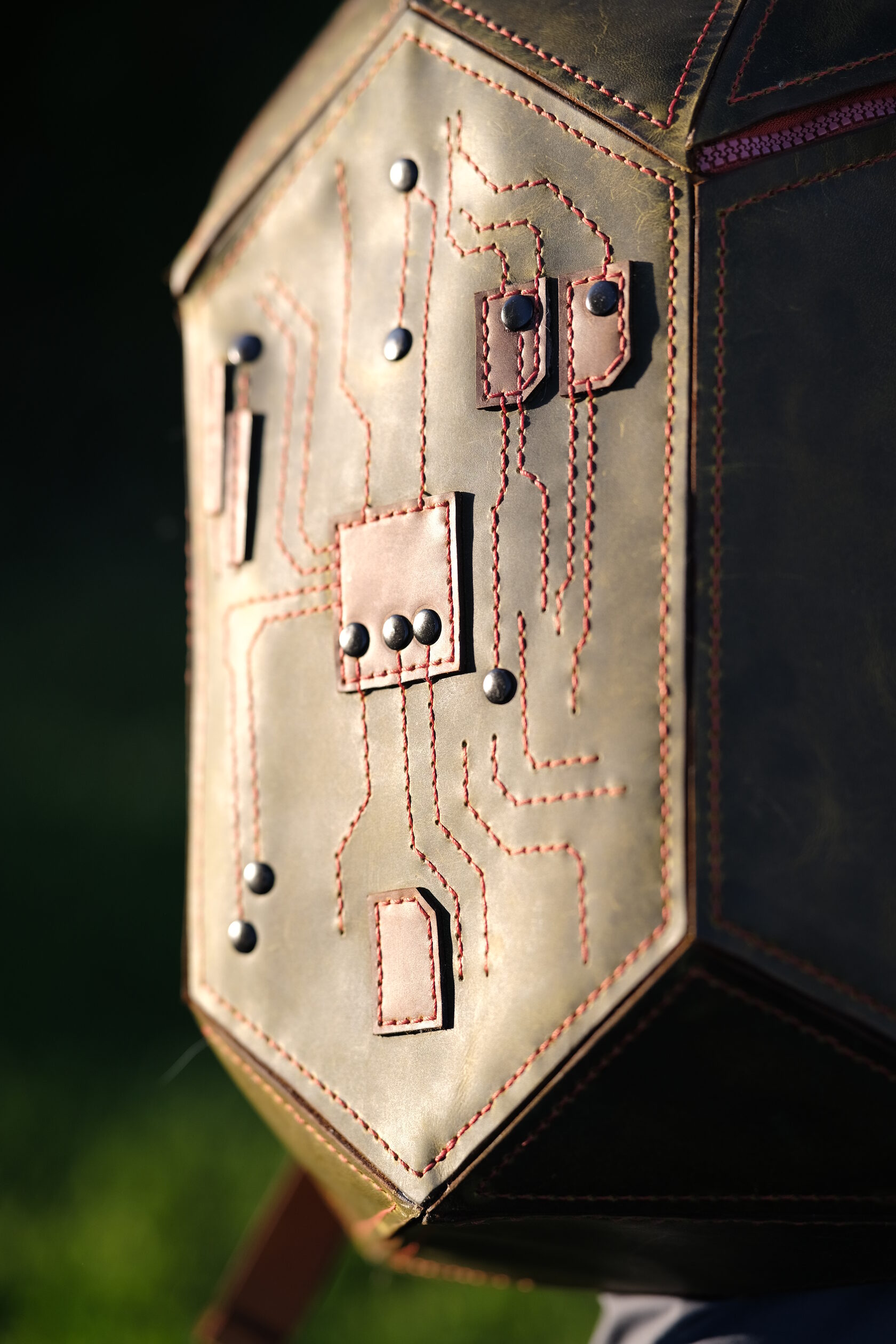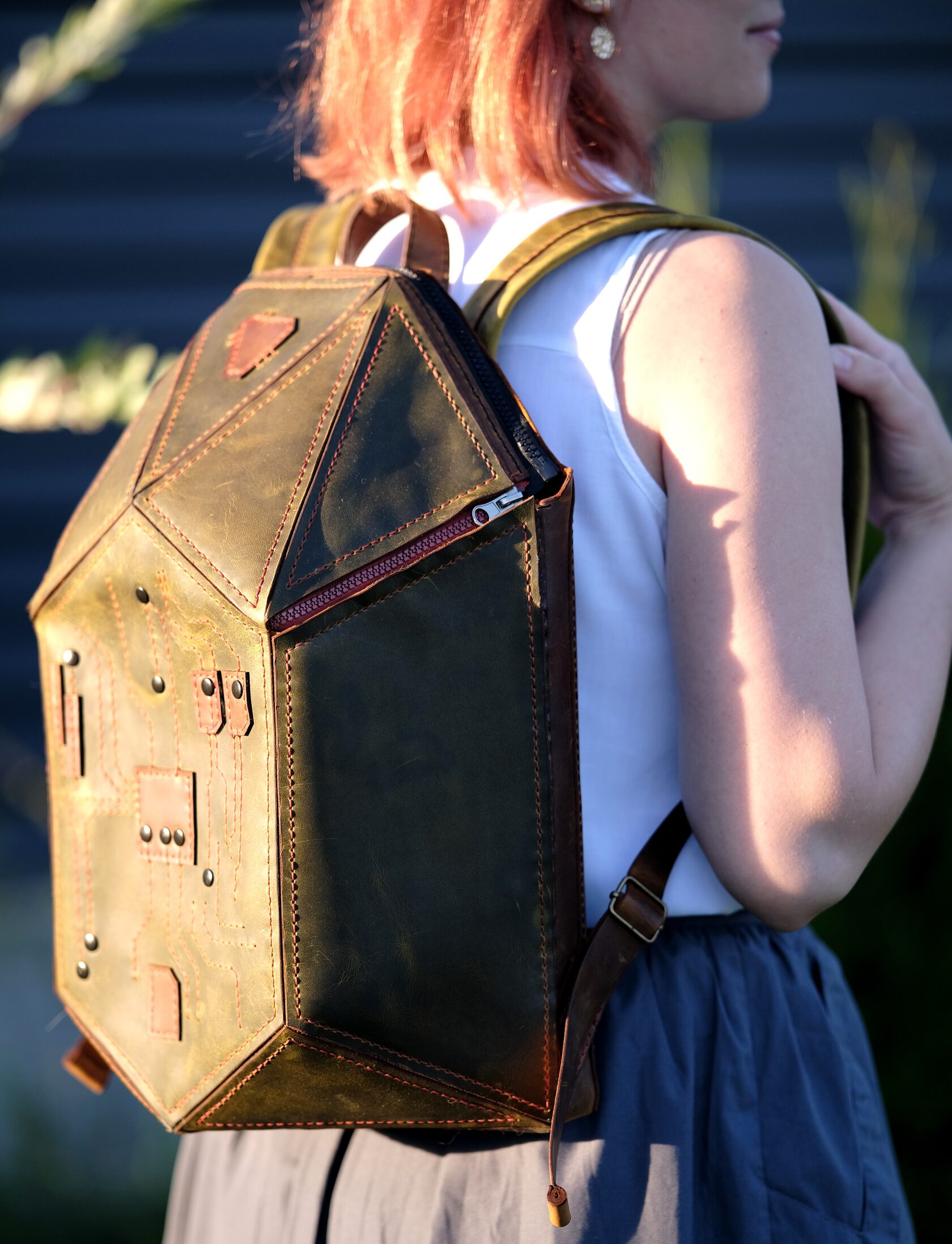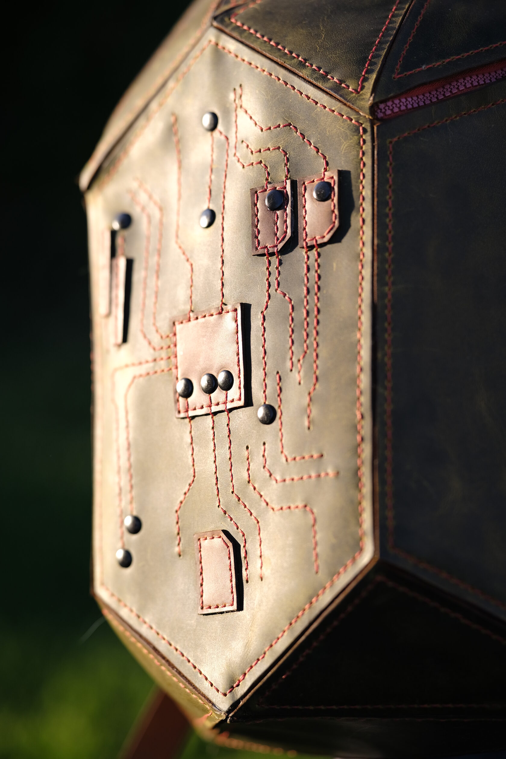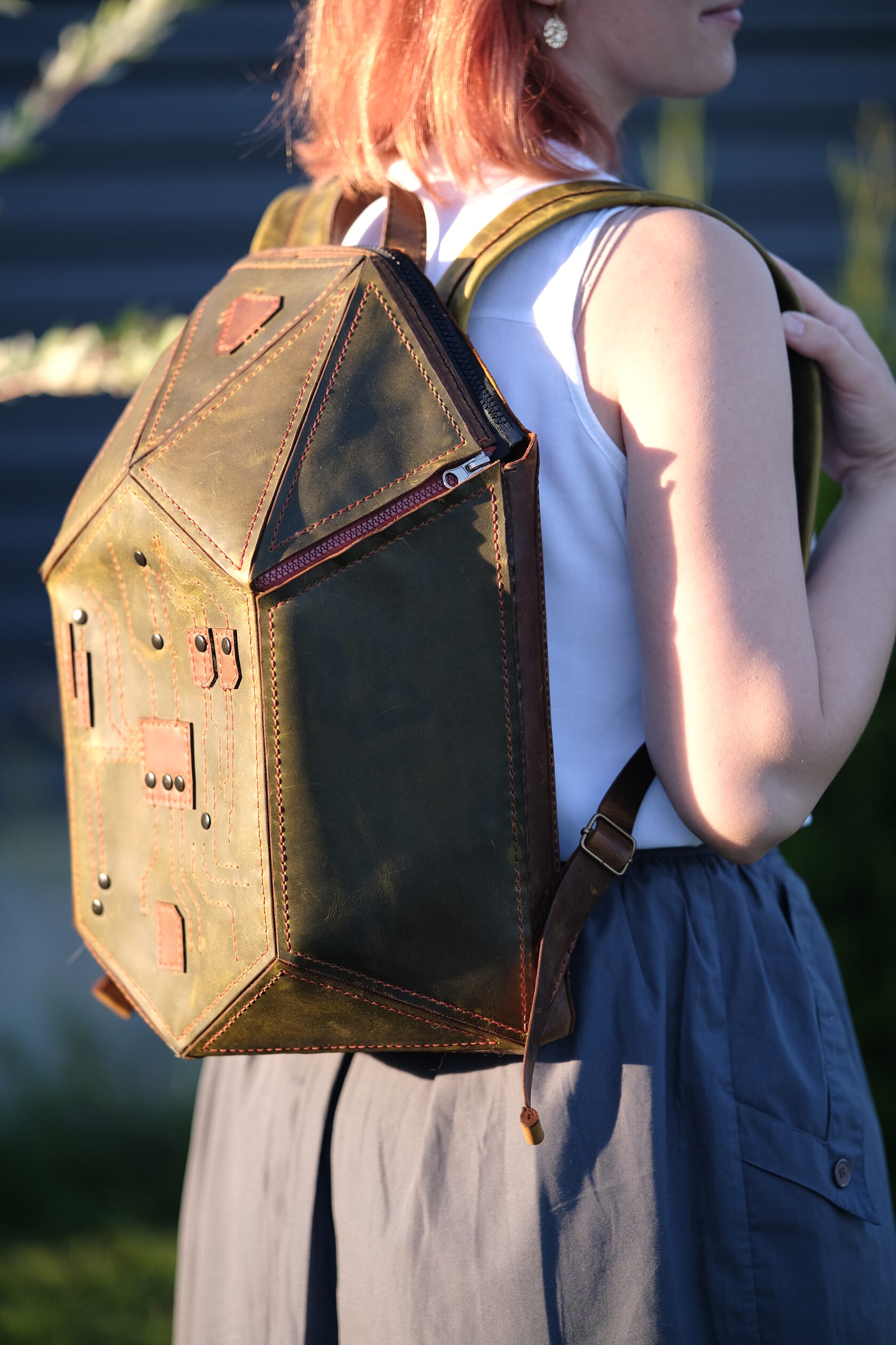 Уникальный рюкзак из натуральной кожи ручной работы, созданный в стиле хай-тек. Геометричная форма и декоративная строчка в виде печатной платы подчёркивают характер владельца — человека технологий и идей. Вместительный, прочный и необычный, он объединяет функциональность и арт-объект, который невозможно не заметить.